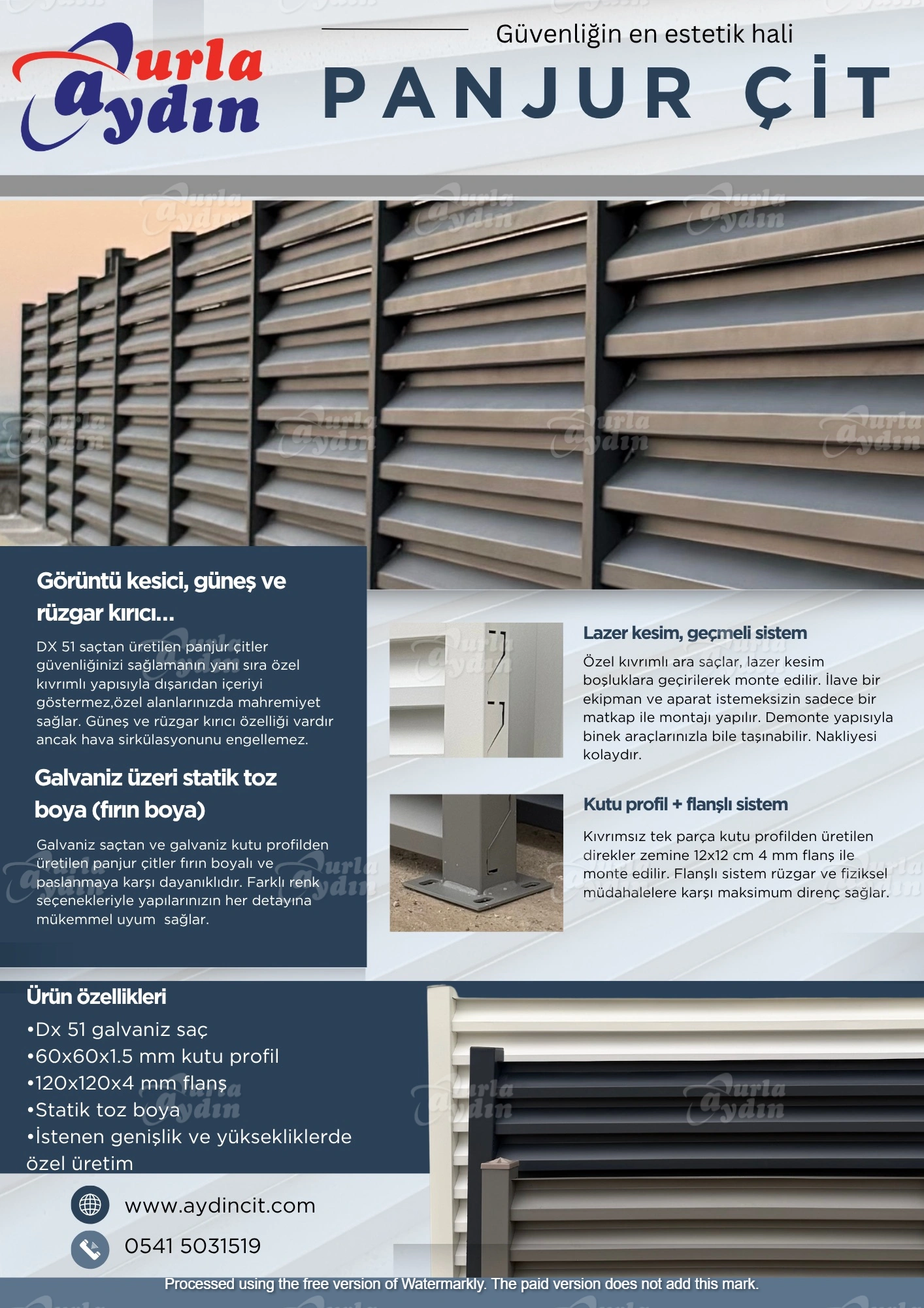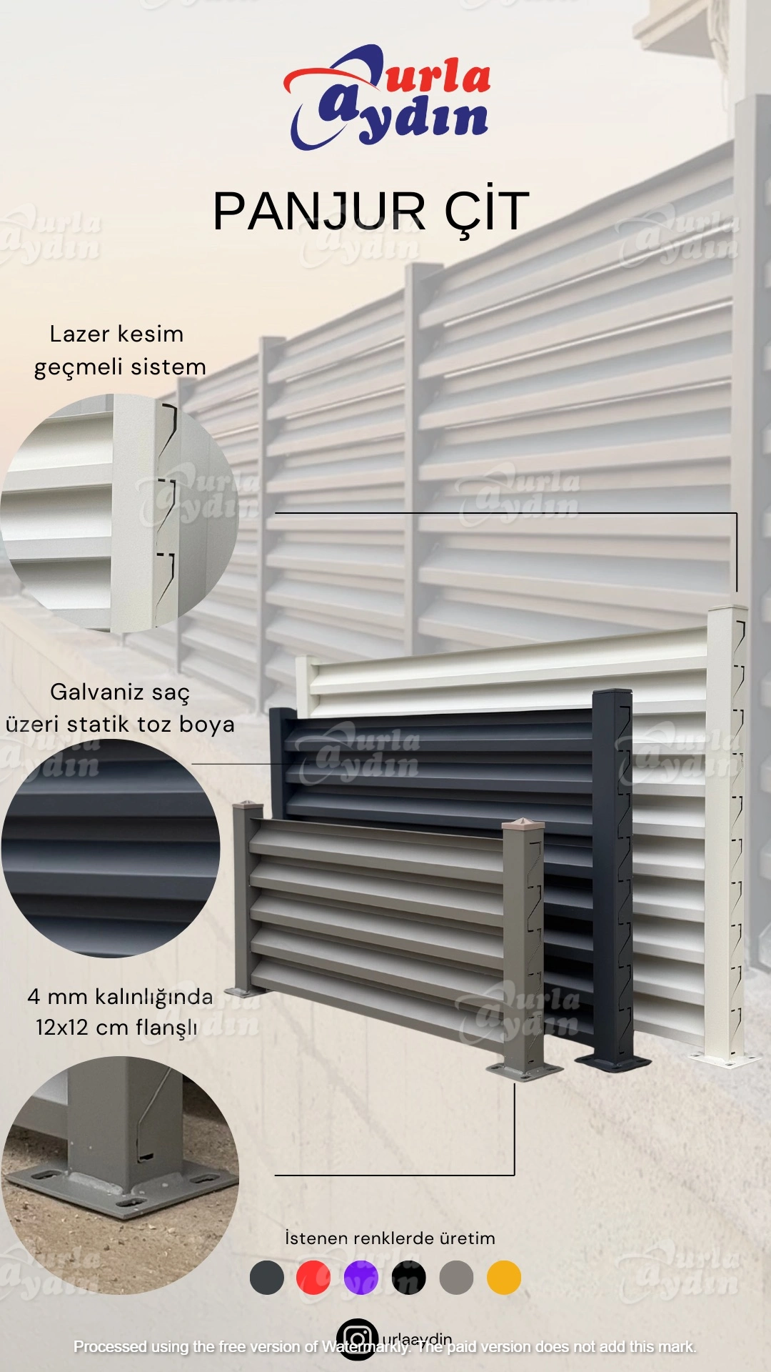 0,6 - 1.1 mm aralığında galvaniz saçlardan ve 60x60 profil direklerden imal edilmektedir. 50 - 70 - 100 - 120 - 150 -200 cm yüksekliklerinde üretirilir. İstenilen renkte fırın boya imkanı olan panjur çit sistemlerimiz nakliye ve montaj konusundaki kolaylığıyla düşük maliyetlerle siz müşterilerimizin beğenisine sunulmaktadır.